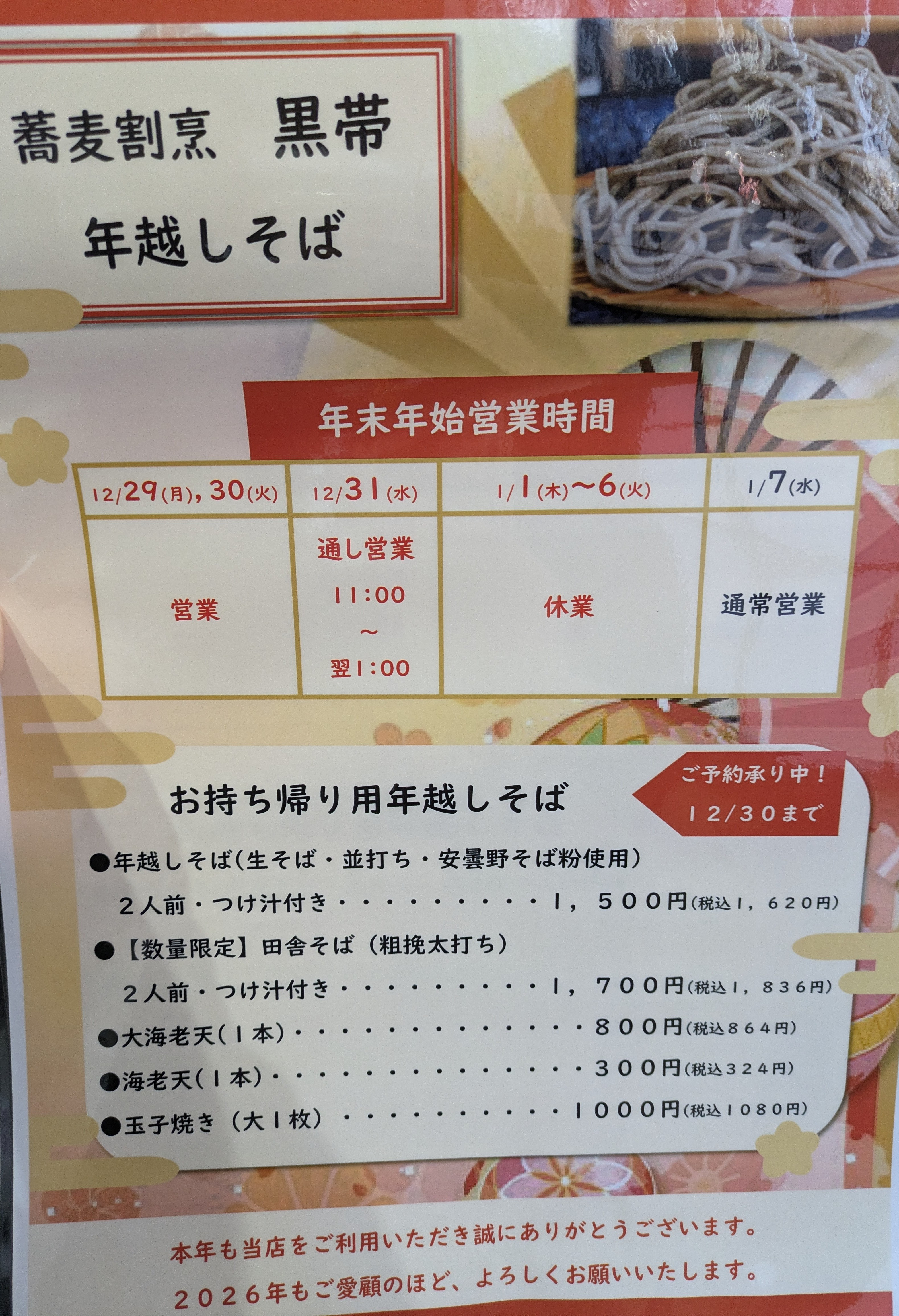 年末年始営業時間・お持ち帰り用年越し蕎麦について